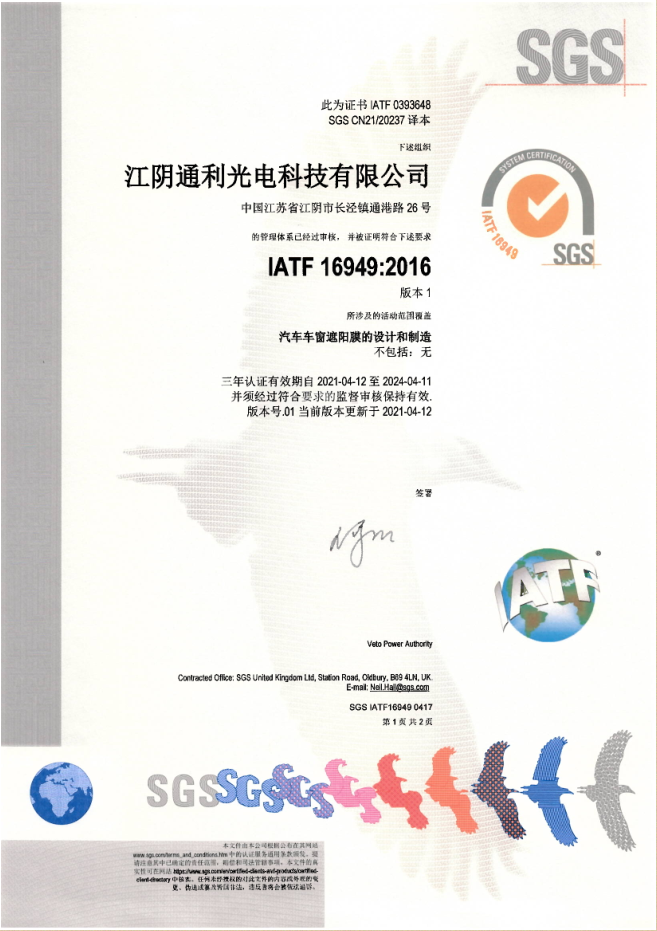 经过严格审定,江阴通利光电科技有限公司顺利通过了IATF(International Automotive Task Force)认证,并收到了IATF16949:2016质量管理体系认证证书。其授予范围:汽车车窗遮阳膜的设计和制造。