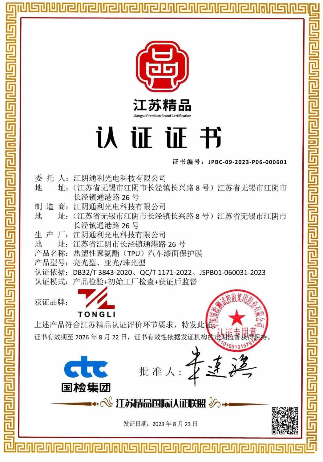 近期江阴通利光电科技有限公司的热塑性聚氨酯(TPU)汽车漆面保护膜亮光型、亚光/珠光型通过了“江苏精品”国际认证联盟认证荣获“江苏精品”认证证书。