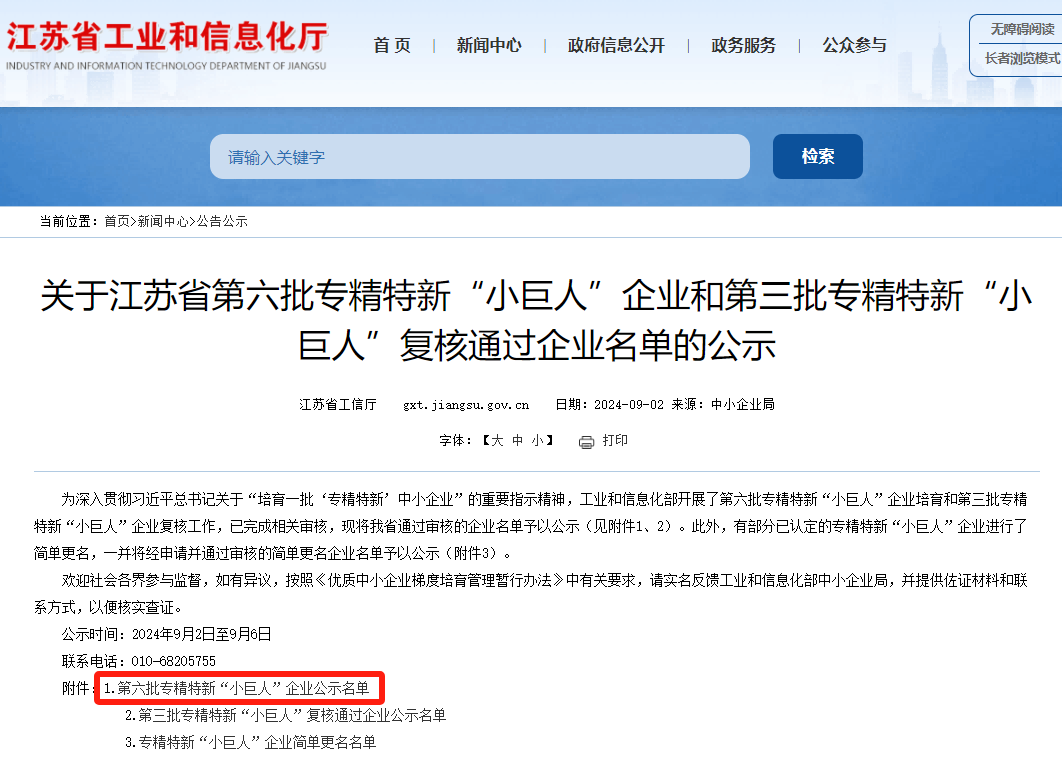 国家工信部发布了关于江苏省第六批专精特新“小巨人”名单。