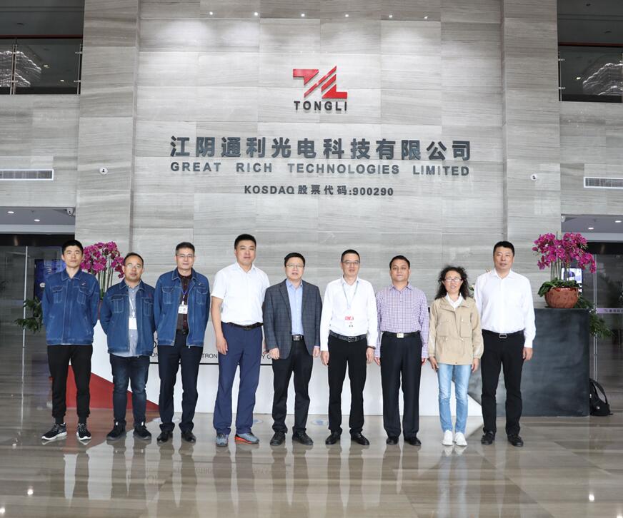 2019年10月22日,江阴市副市长、江阴市科技镇长团团长许长春,江南大学化学与材料工程学院院长东为富,江阴市委办公室主任徐海一行来到江阴通利光电科技有限公司(以下简称“通利科技”)参观考察,镇党委书记江国虔陪同参观。通利科技董事长周永南、副总经理向江哲热情接待。