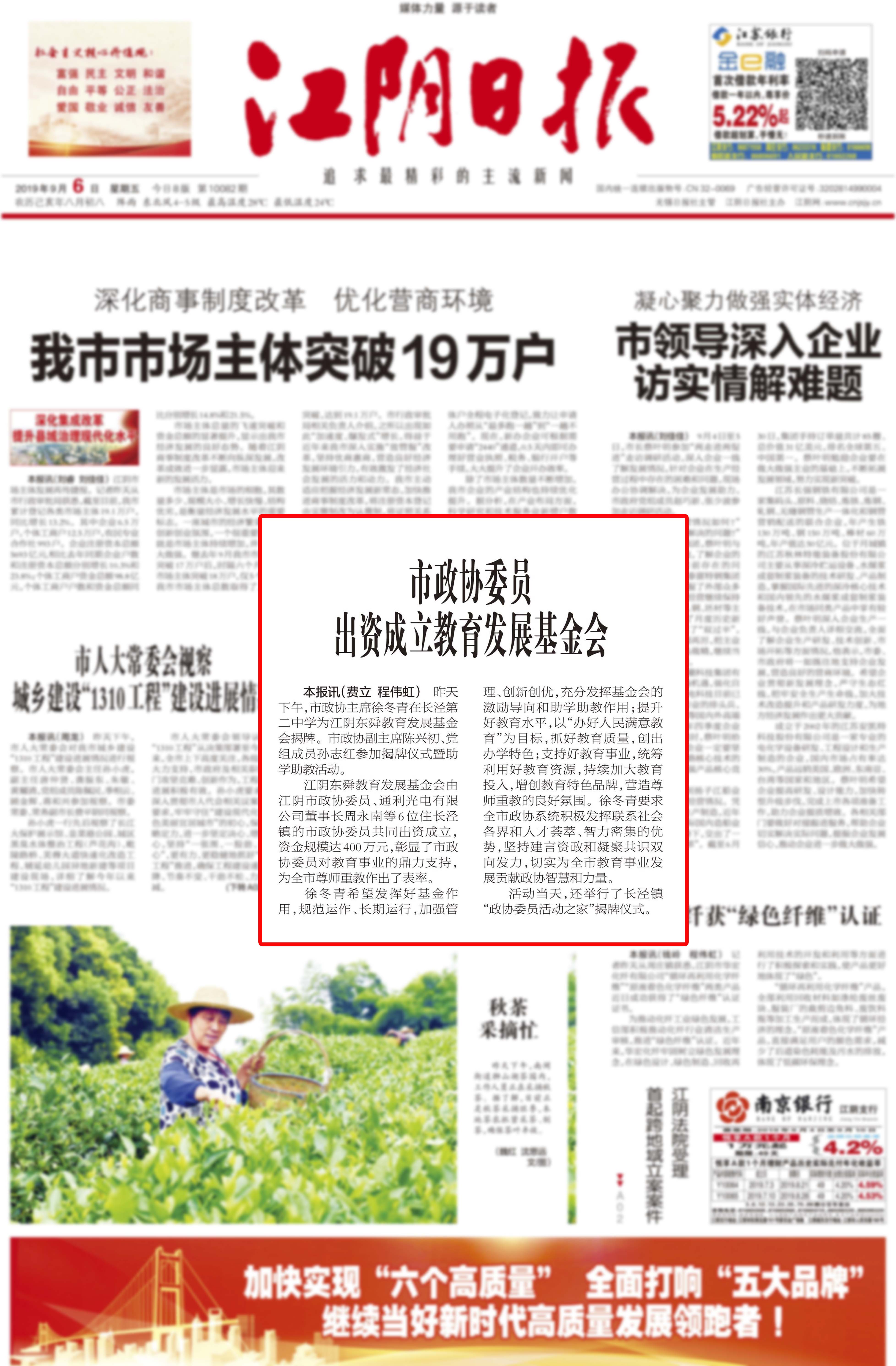 江阴日报:市政协委员出资成立教育发展基金会