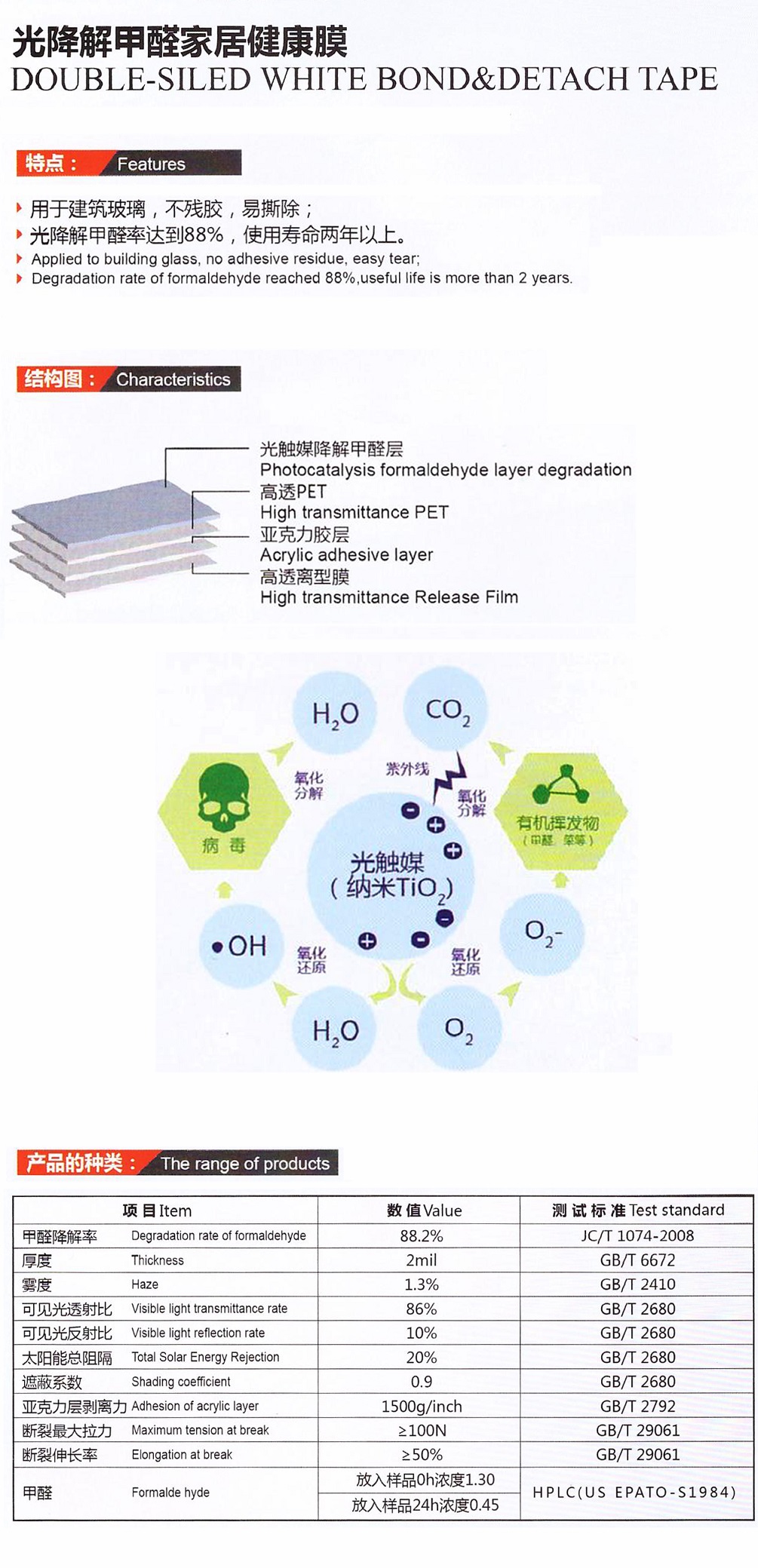 利用光触媒技术降解甲醛,将甲醛分解为无害无味物质,光触媒处理技术是目前在用的很高效的室内污染处理方式之一,它在吸味和清新空气上面有很多独到之处,能够除蹒和消除异味,释放大量富氧离子。以光催化材料反应的催化剂TiO2,在紫外线照射下发生,吸收紫外线,反应速度快,时间短,生成产物为CO2、H2O及无机盐等,不会造成二次污染,绿色环保,效率高,成本低。广泛应用于新居、办公室、橱窗等玻璃。高透光,高降解率,低雾度。