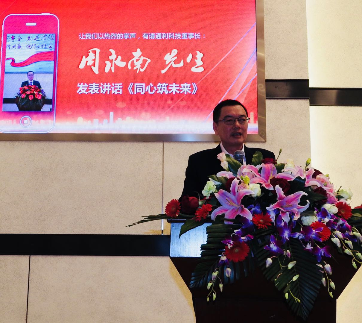 下午两点,大会在全体员工的热烈掌声中拉开了帷幕。通利科技董事长周永南代表公司董事会向到场的600多位公司同仁致辞,对获得“通利之星”称号的先进团队和个人表示最衷心地祝贺,向辛勤奋斗在公司各个岗位上的全体员工表示最衷心的感谢。感谢大家一年来的辛勤付出和对公司的无私奉献;感谢大家在不平凡的2017年与公司同舟共济、荣辱与共!