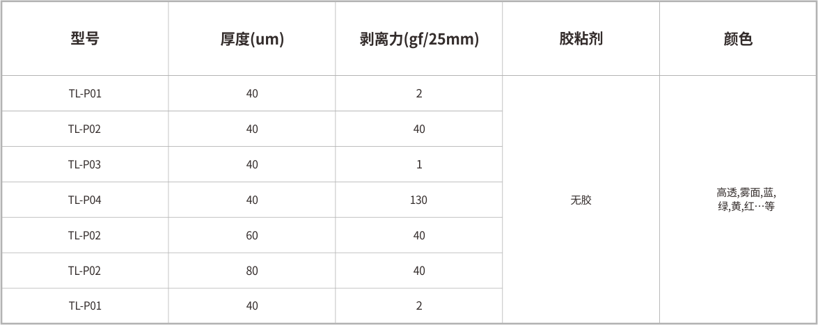 • 无胶,剥离力变化小,易于贴合及剥离;