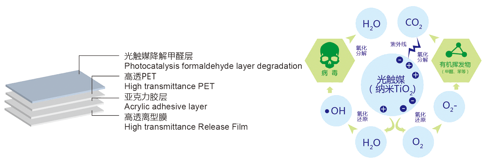• 能将空气中的甲醛HCHO催化成二氧化碳CO2和水H2O。24h光降解甲醛率达到88% ,使用寿命两年以上。