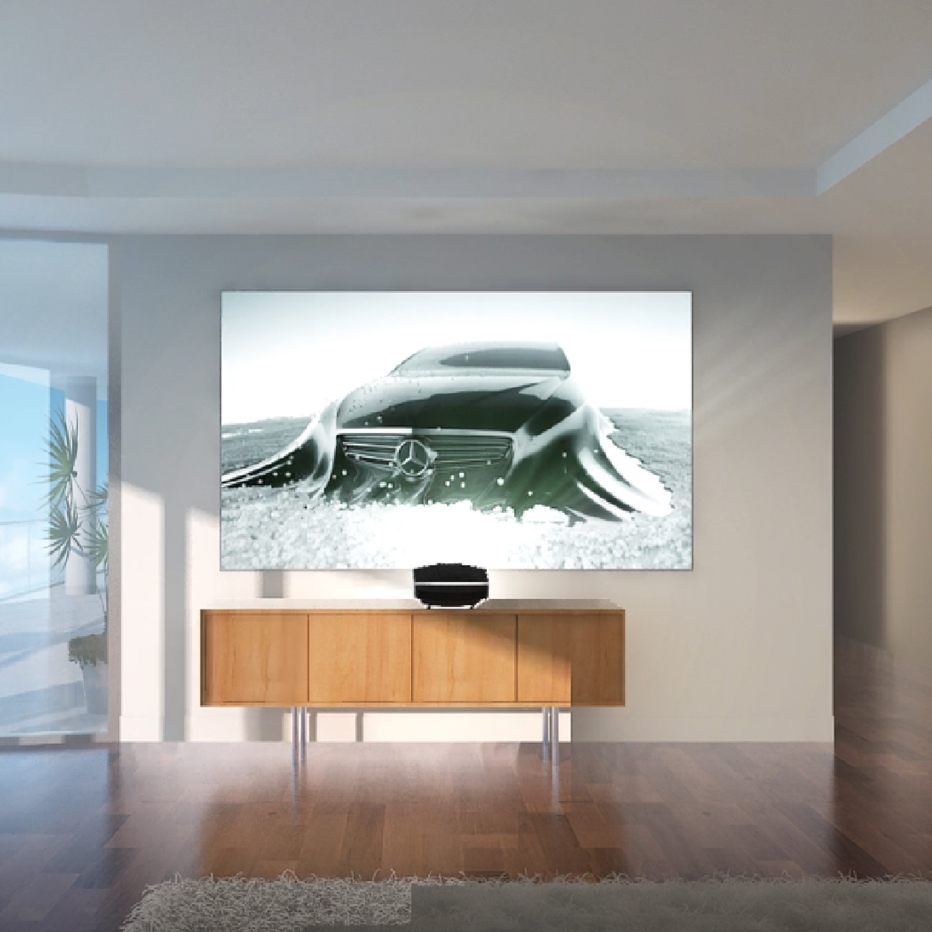 (激光电视是采用反射式超短焦投影机和投影布幕组成,但在开灯环境下画面相行失色,必需结合抗光布幕才能把激光显示全面普及。)