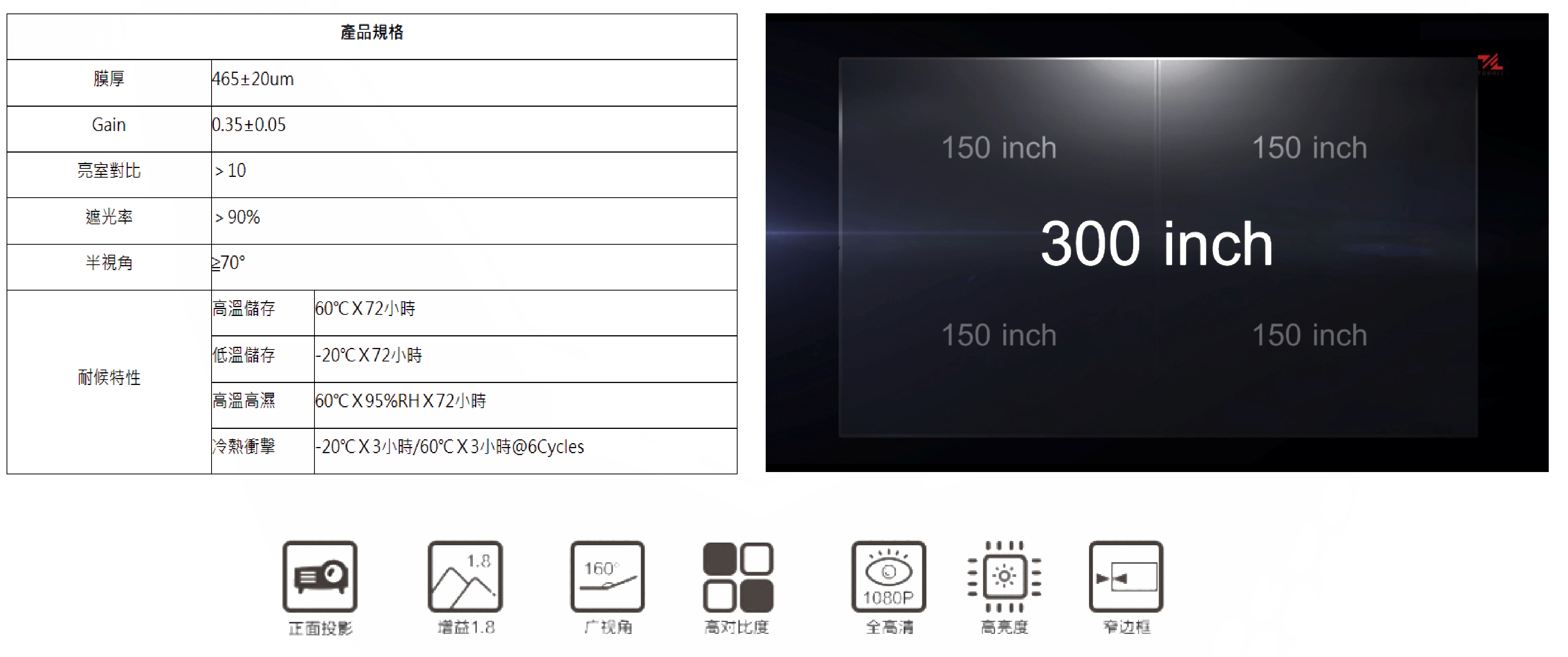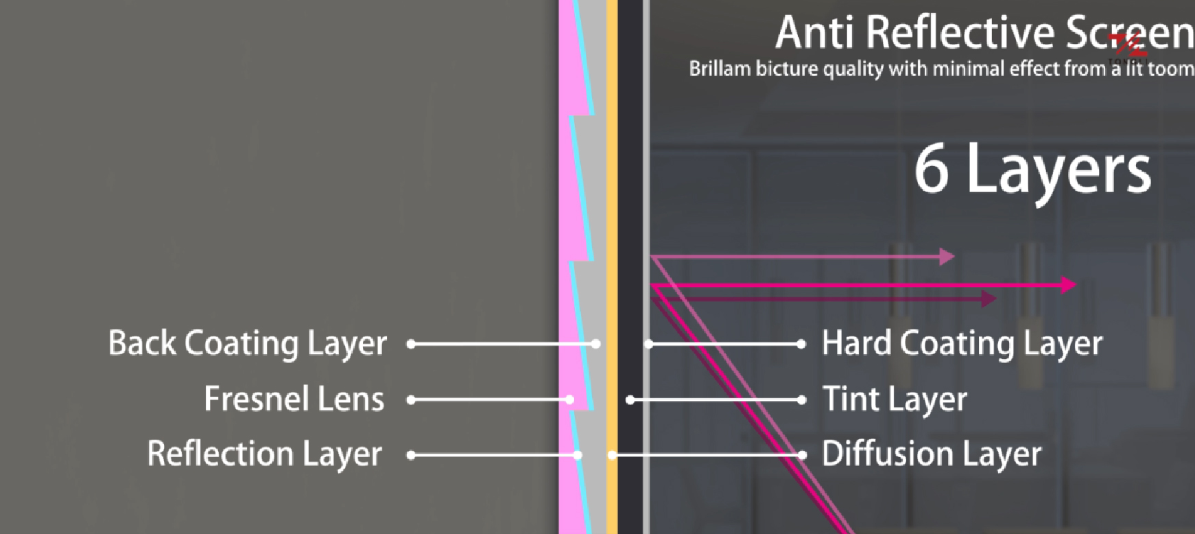 • 显像层将来自投影机的每一束光线精准反射在屏幕上;碳晶层使画面黑位纯正,立体感强,画面呼之欲出,同时使对比度强于普通幕布10倍;扩散层的应用让画面清晰柔和,长久观看视觉不疲劳、利于保护视力;折射层可以让用户获得170度的超大视角;还有防刮涂层,可以有效的防止日常的划伤,并让表面易与清理。